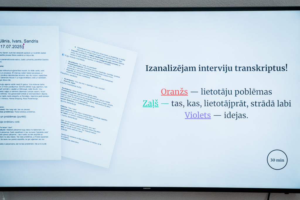 Lietotāju pieredzes izzināšanas gaitā tika intervēti kravu un kuģu aģenti – tieši viņu ikdienas darbs atklāja galvenos sāpju punktus. Izrādījās, ka būtiska problēma ir atkārtota datu ievade dažādās sistēmās un vāja savietojamība ar Valsts ieņēmumu dienesta un muitas informācijas sistēmām. “Lietotāju pieredze bija mūsu mugurkauls,” norāda Jeļena Solovjova, fasilitatore un pakalpojumu dizainere, kura vadīja procesu. “Mēs ar lietotājiem mijiedarbojāmies divos inovācijas sprinta posmos – veicām intervijas ar kuģu un kravas aģentiem, apkopojām informāciju un pēc tam kartējām iegūto informāciju un to vizualizējām, lai procesi būtu vieglāk saprotami. Izmantojām pakalpojumu rasējumu jeb Service Blueprint karti, lai saprastu, kā izskatās lietotāja ceļš, kādi procesi norisinās fonā un kur notiek informācijas dublēšana. Tas ļāva komandai saskaņot vīziju un mērķus. Otrajā daļā mēs prototipējām un testējām mūsu risinājumus ar gala lietotājiem.”